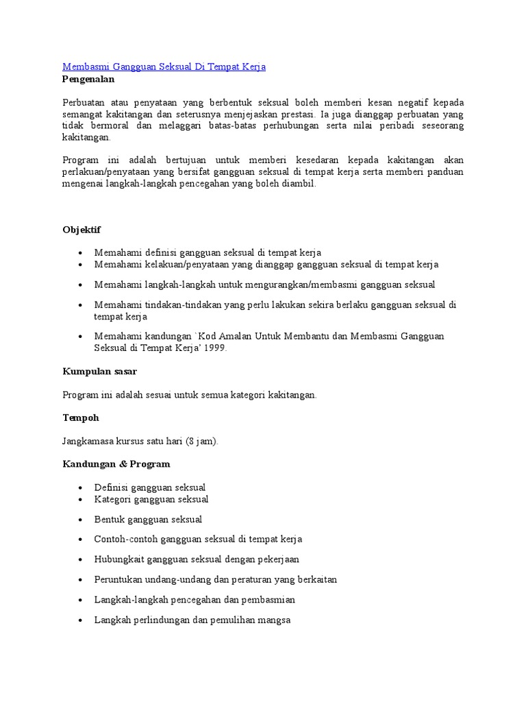 Https Publisher Uthm Edu My Ojs Index Php Jts Article Download 1393 940 from Sedihnya, gangguan seksual tidak hanya berlaku di sekolah. Sekiranya tempat kerja tersebut di dominasi oleh kaum lelaki, maka kaum wanita di tempat kerja tersebut akan cenderung mengalami gangguan seksual. Kamu juga mungkin dapat menghalang seorang. Kita sering mendengar berita gangguan seksual yang dilakukan lelaki terhadap perempuan di tempat kerja. Peristiwa gangguan seksual bole11 mewujudkan suasana kerja tidak tenteram dan tidak menarik. Ganguan seksual merupakan suatu fenomena negatif di tempat kerja yang boleh memberi kesan buruk kepada pekerja yang menjadi mangsa. Gangguan seksual di teinpat kerj a inerangkuini perilaku bukan sahaja. Tetapi jika kamu memupuk keyakinan diri dan kemahiran untuk menangani gangguan seksual sekarang, kamu akan bersedia untuk menangani masalah ini di tempat kerja kamu kelak.