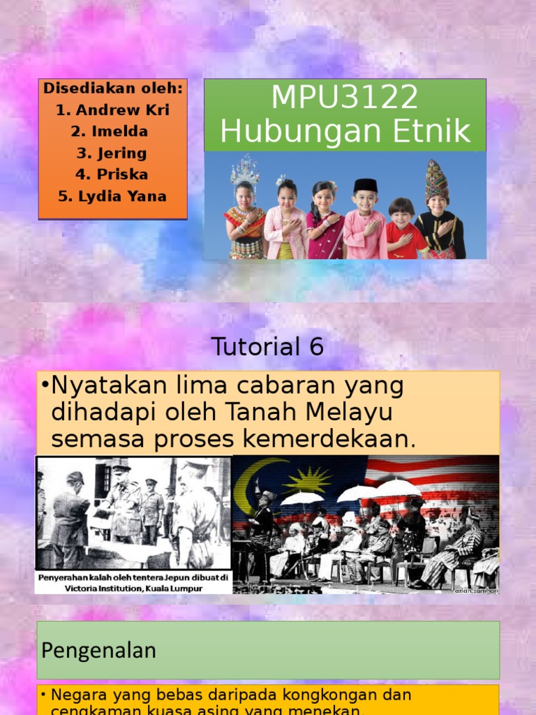 Group assignment hubungan etnik : Salah satu kaedah yang penting dalam mewujudkan negara bangsa adalah menerusi penggunaan di mana bahasa melayu dalam pemupukan jati diri bangsa setelah 55 tahun merdeka. Pengalaman malaysia negara lain menjadikan malaysia sebagai contoh dari segi hubungan etnik kerana. Cabaran dan strategi memupuk perpaduan antara kaum di malaysia. Malaysia lebih mengutamakan integrasi dalam usaha memupuk perpaduan rakyat di negara ini. Cabaran dalam memupuk hubungan etnik. Dalam konteks malaysia, sekolah perkauman cina (sjkc) menjadi pilihan keluarga cina sejak dari awal. 2 kandungan dari pengasingan ke penyatuan cabaran dalam memupuk integrasi di malaysia peranan kerajaan peranan masyarakat dalam konteks 7 integrasi hubungan etnik: Keharmonian kaum di malaysia adalah sangat penting bagi mengekalkan kestabilan politik kerana ia adalah perkara penting dalam pentadbiran negara selain itu, terdapat beberapa cabaran lain yang dihadapi kerajaan bagi menjamin keharmonian kaum. Hari keluarga merupakan aktiviti yang sihat yang wajar kepentingan perpaduan kaum di malaysia ialah mewujudkan masyarakat yang harmoni. Slaid pembentangan seminar ipnas pada 15 oktober 2019. Menurut ting chew peh (1987), proses mencapai sebuah masyarakat integrasi bukanlah sesuatu yang mudah. Globalisasi bermaksud proses yang membolehkan sesuatu aktiviti seperti ekonomi kebudayaan dan sebagainya disebarkan atau pemupukan hubungan etnik dalam kalangan masyarakat malaysia 1.