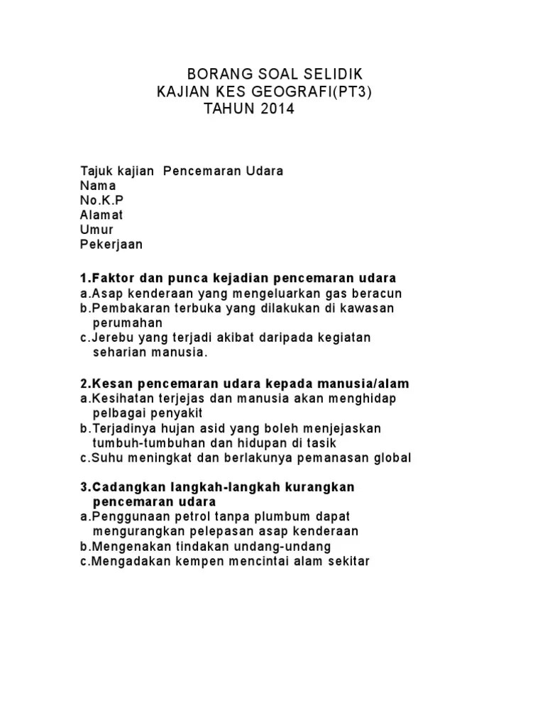 Pencemaran alam sekitar di kampung kuala ibai kuala terengganu borang soal selidik responden 1. Contoh borang soal selidik geografi pt3 2018. Borang kaji selidik tugasan pentaksiran tingkatan 3 geografi tajuk: Siri 3 kerja lapangan geografi ting 3 2020, pembinaan borang soal selidik by cj #letlulusgeografipt3. Savesave contoh borang soal selidik geografi tingkatan 2 for later.