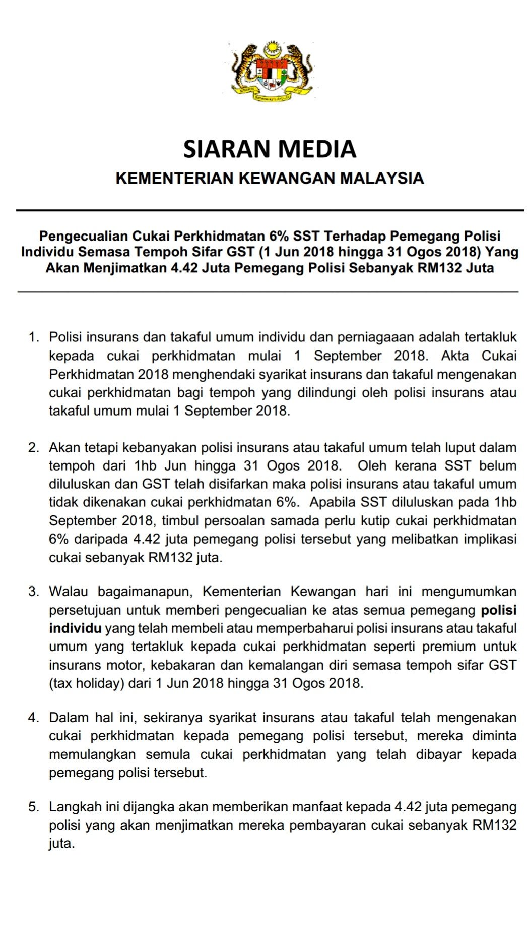 Bab i permulaan tajuk ringkas 1. Tidak berdaftar dengan jkdm dan perkhidmatan dikenakan cukai di bawah akta cukai perkhidmatan 2018 lampiran 20: Perkhidmatan (gst) mulai 1 september 2018 berdasarkan akta cukai jualan 2018 akta 806 dan akta cukai perkhidmatan 2018 akta 807. Perkhidmatan penerbangan yang disediakan pada atau selepas 1 september 2018 dikenakan cukai perkhidmatan 6%. (2) perintah ini mula berkuat kuasa pada 1 september 2018.