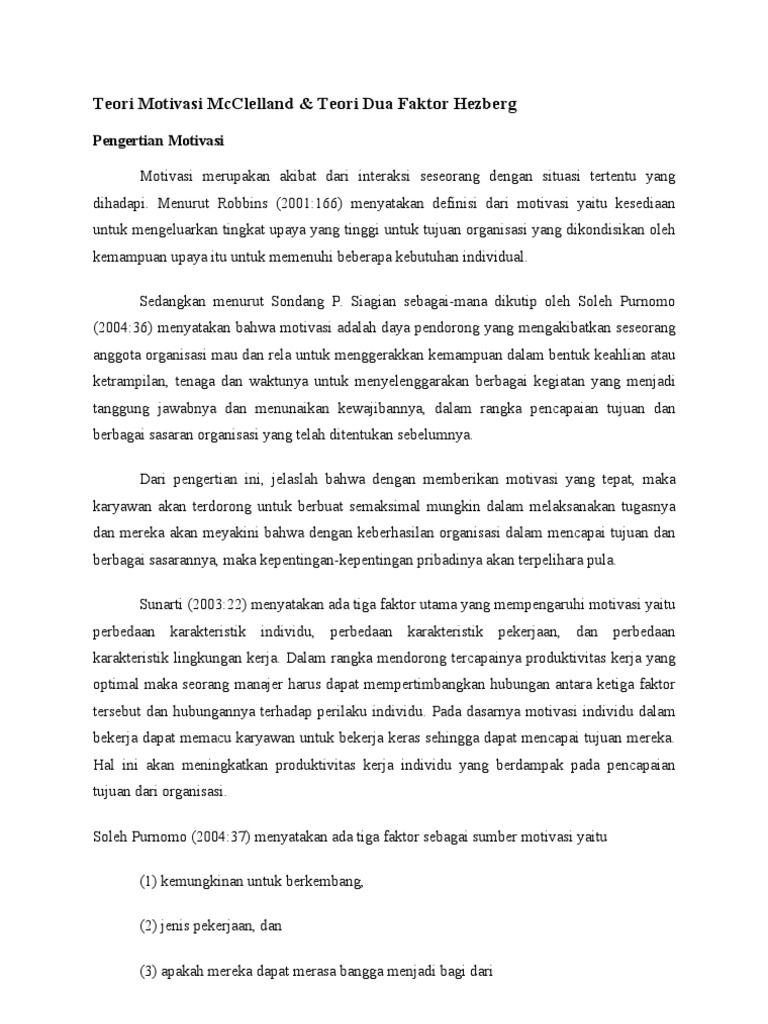 Definisi motivasi motivasi didefinisikan sebagai proses. Hal ini kemudian dapat membantu anda untuk memberikan pujian dan umpan balik secara efektif, memberikan mereka tugas yang cocok, dan menjaga mereka termotivasi. Teori ini berfokus pada tiga kebutuhan yaitu kebutuhan pencapaian (need for achievement), kebutuhan kekuasaan (need for power), dan kebutuhan hubungan (need for affiliation). David mcclelland (robbins, 2001 : Konsep teori kebutuhan mcclelland teori kebutuhan mcclelland menyatakan bahwa pencapaian, kekuasaan/kekuatan dan hubungan merupakan tiga kebutuhan penting yang dapat membantu menjelaskan motivasi.